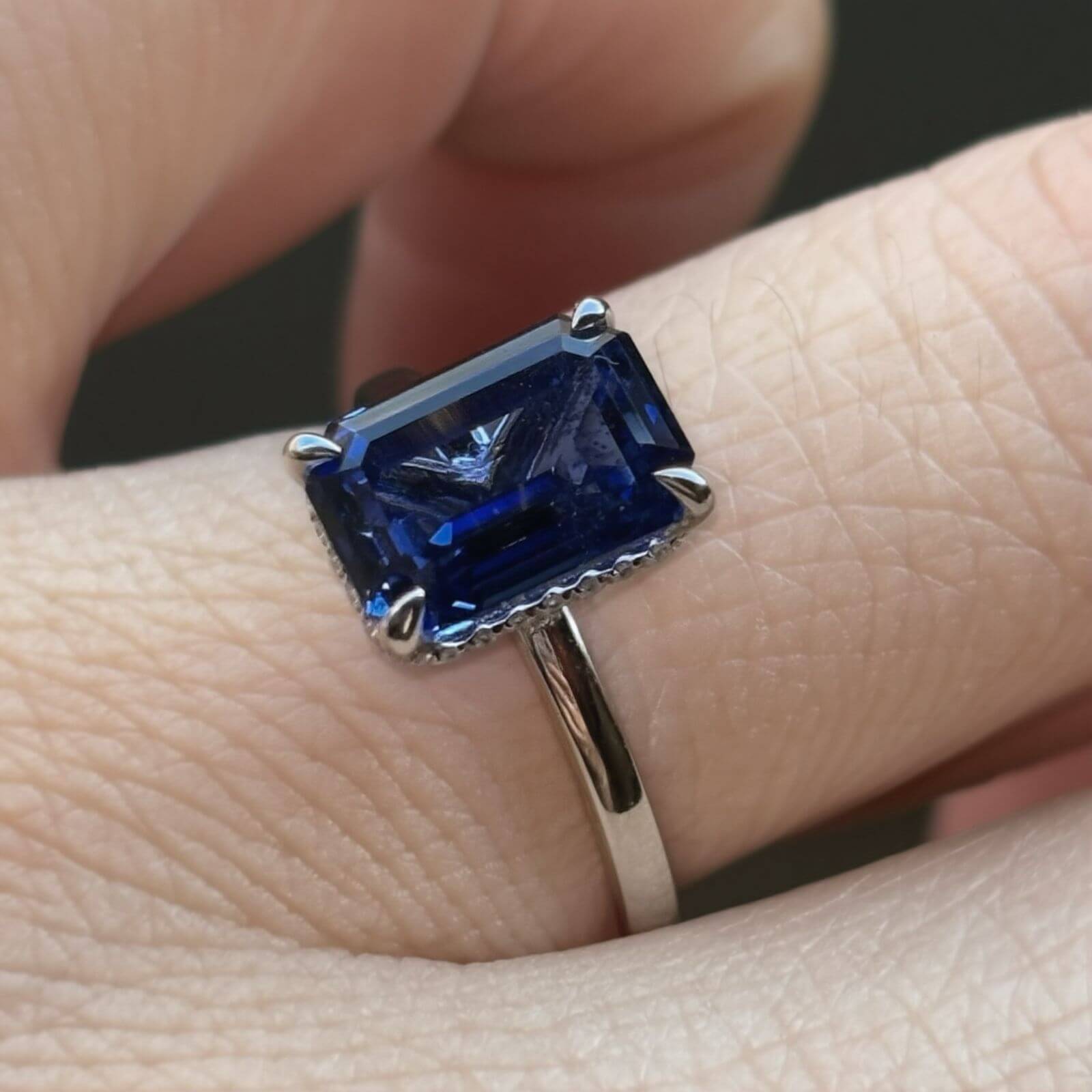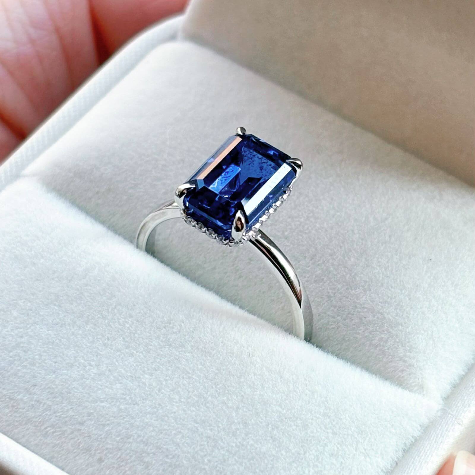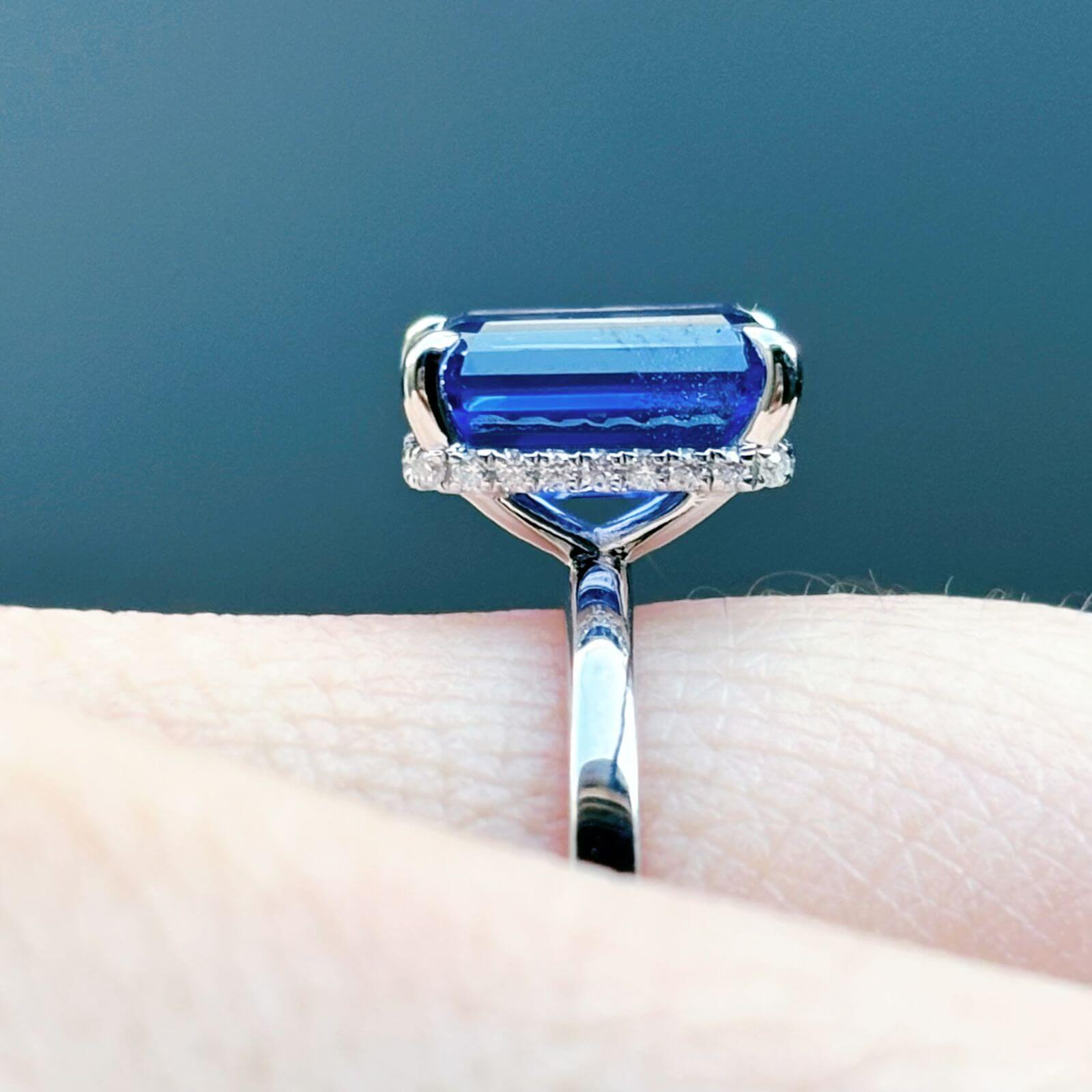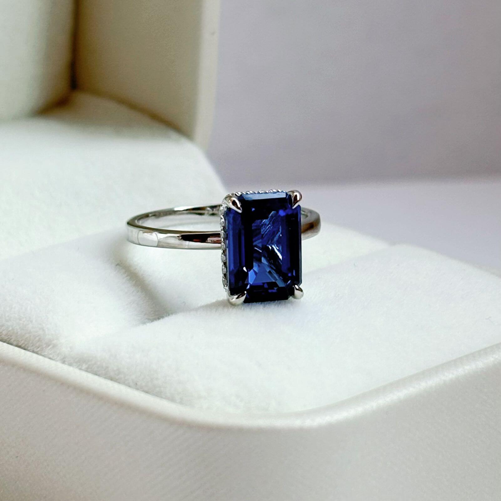 Este anillo de compromiso destaca por su zafiro de laboratorio en corte esmeralda de 3 quilates, una gema de presencia imponente, brillo profundo y una elegancia atemporal que no pasa desapercibida.