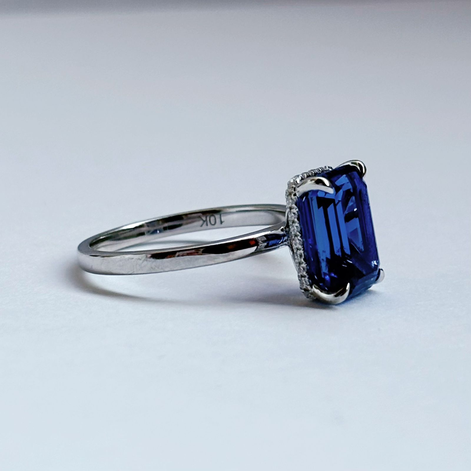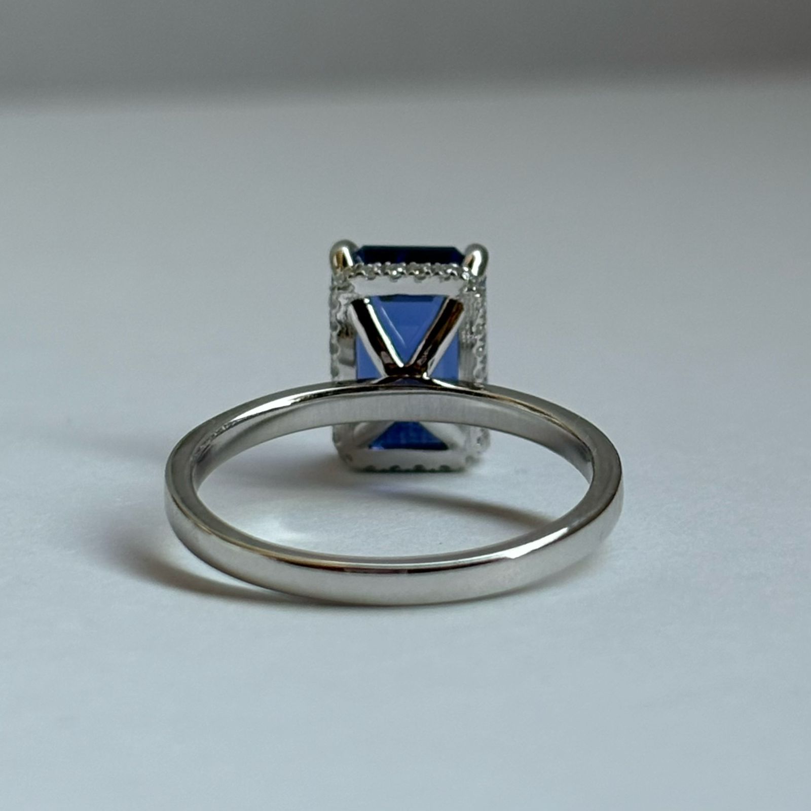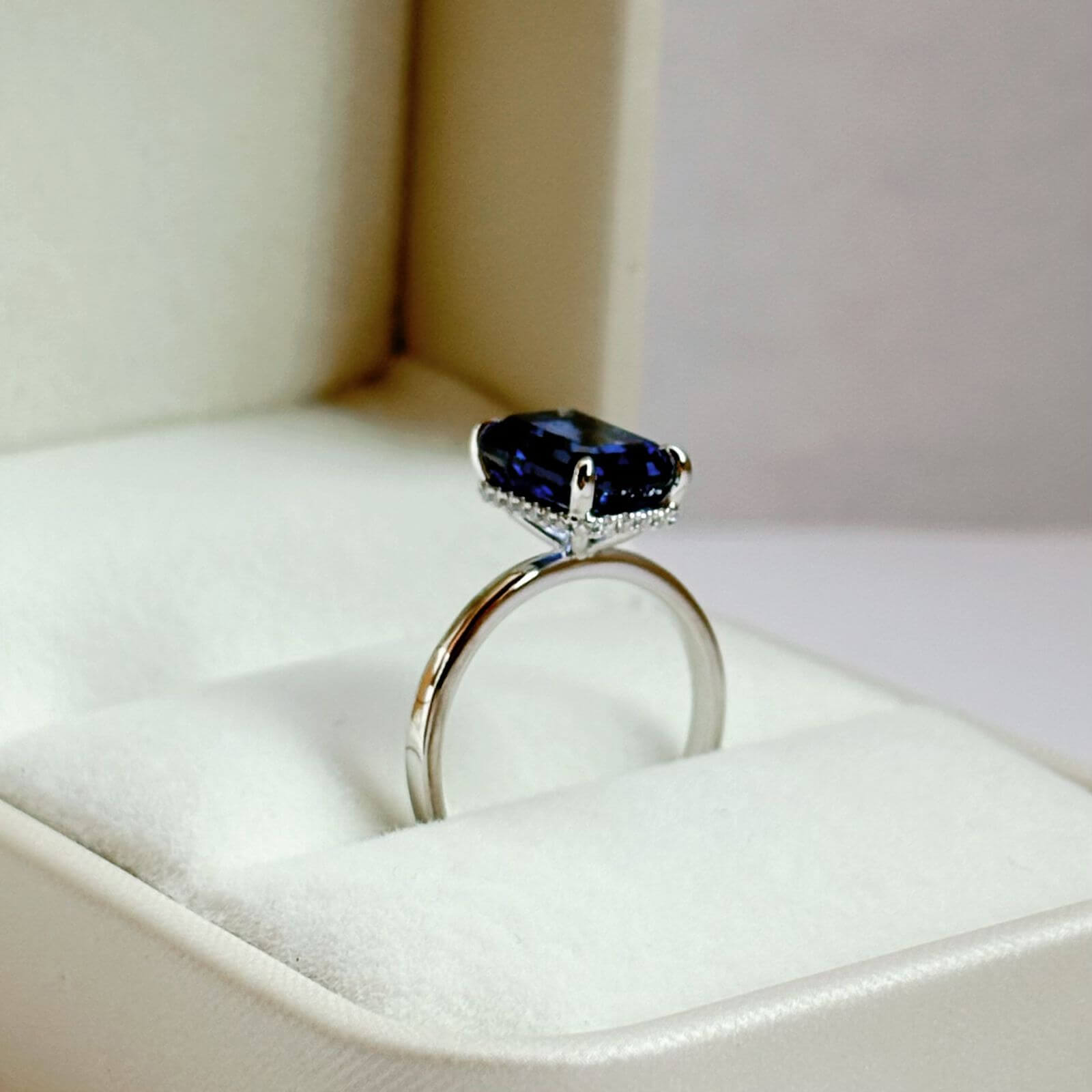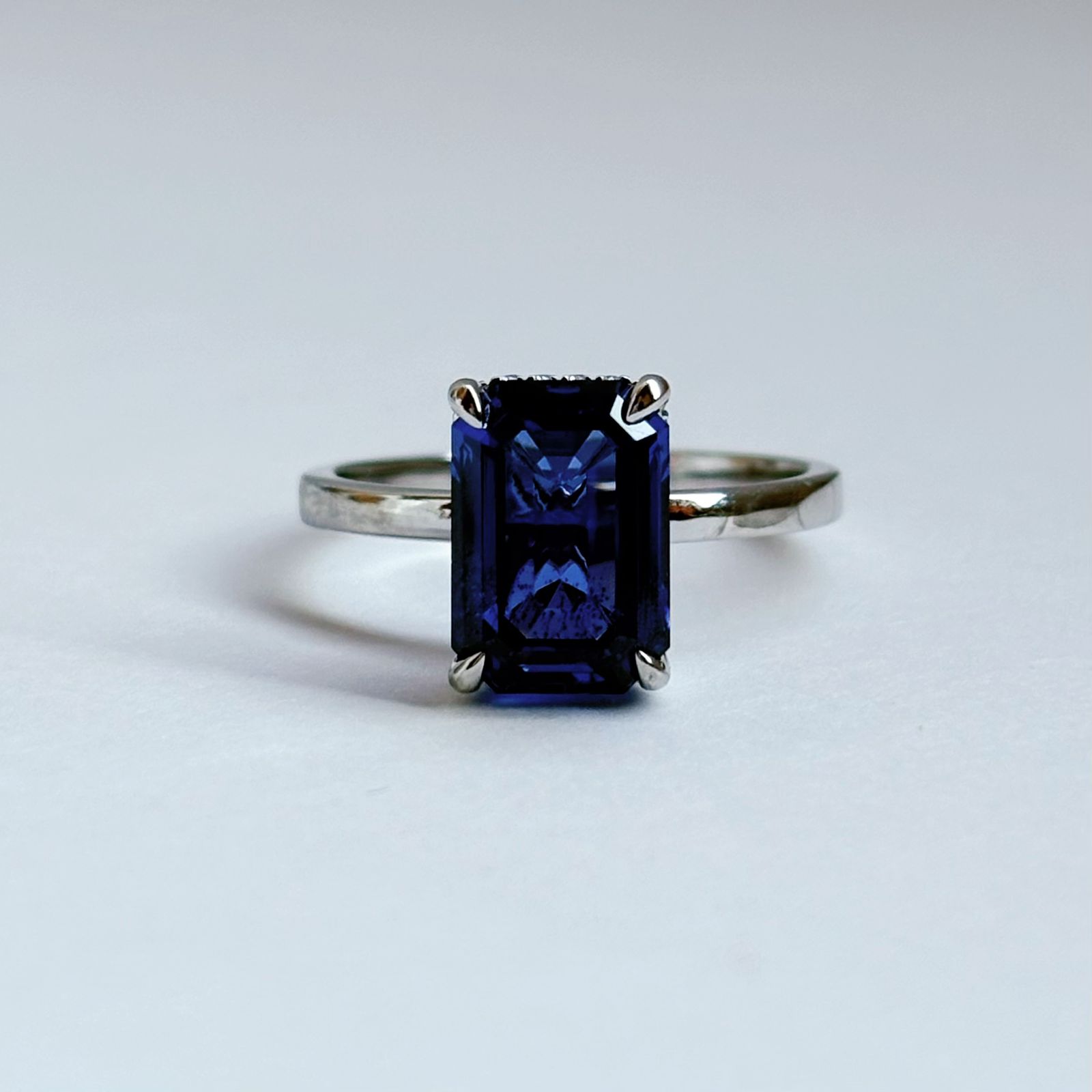Este anillo de compromiso destaca por su zafiro de laboratorio en corte esmeralda de 3 quilates, una gema de presencia imponente, brillo profundo y una elegancia atemporal que no pasa desapercibida.