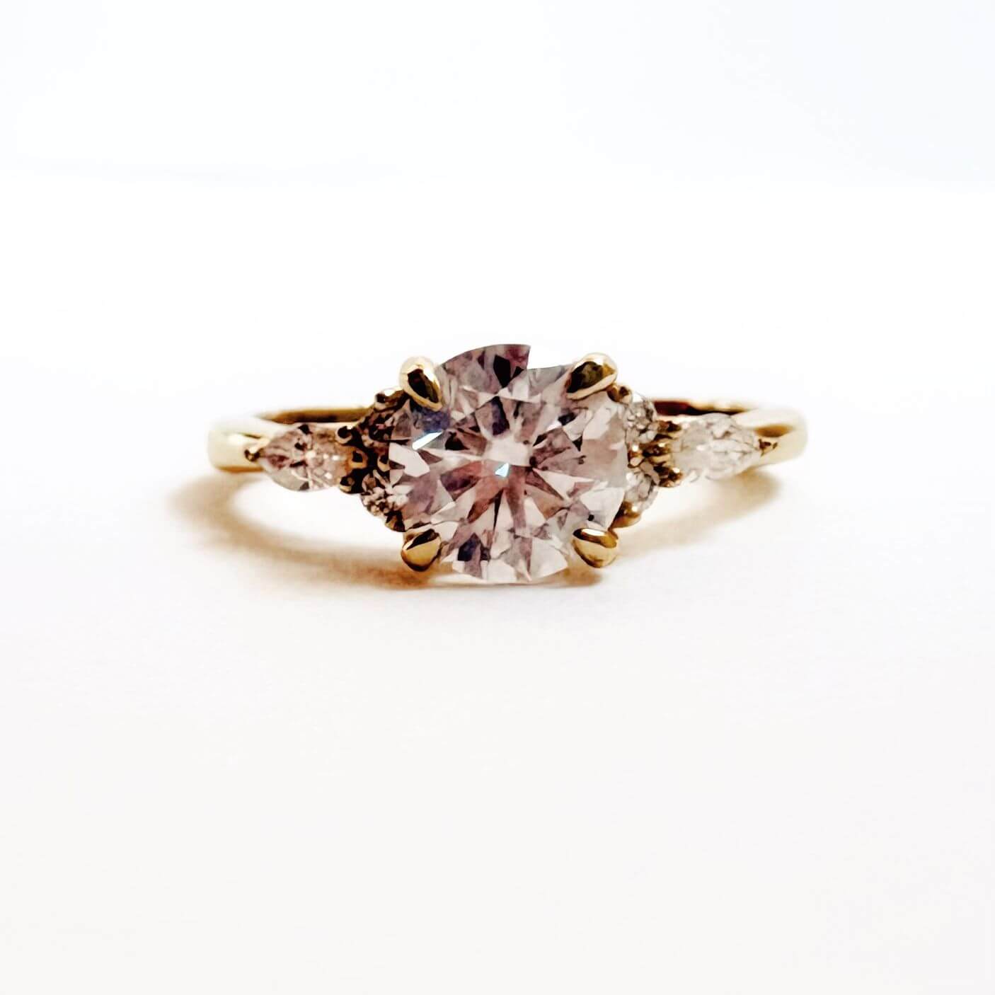 Aurora es una pieza que presenta una moissanita en corte brillante de 1.0 ct engastada en el centro de un grupo de cristales blancos brillantes en cortes marquesa y redondo. El grupo está diseñado para transmitir el máximo brillo; en resultado una exquisita obra de arte. Nuestra dedicación a la artesanía meticulosa y nuestra experiencia con piedras decorativas garantizan que todas las gemas estén engastadas de manera experta, sin importar la variación de tamaño, ubicación y estilo.