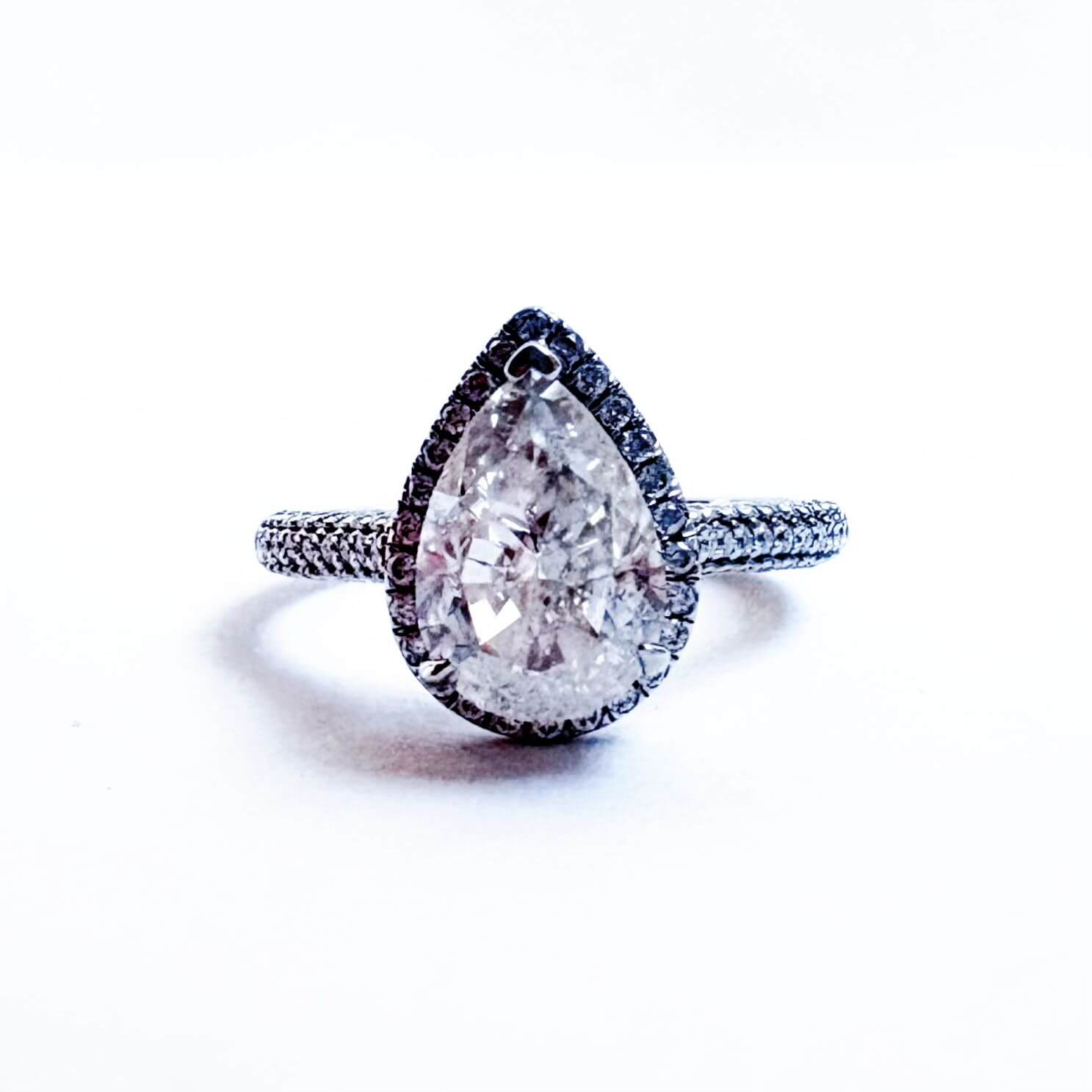Un diseño que combina elegancia y presencia. Nuestro anillo Isabella está protagonizado por una moissanita corte pera de 2 quilates, enmarcada por un halo de brillantes y un pavé fino a lo largo de su banda. Cada piedra ha sido cuidadosamente engastada, resaltando la dedicación artesanal detrás de esta joya única.