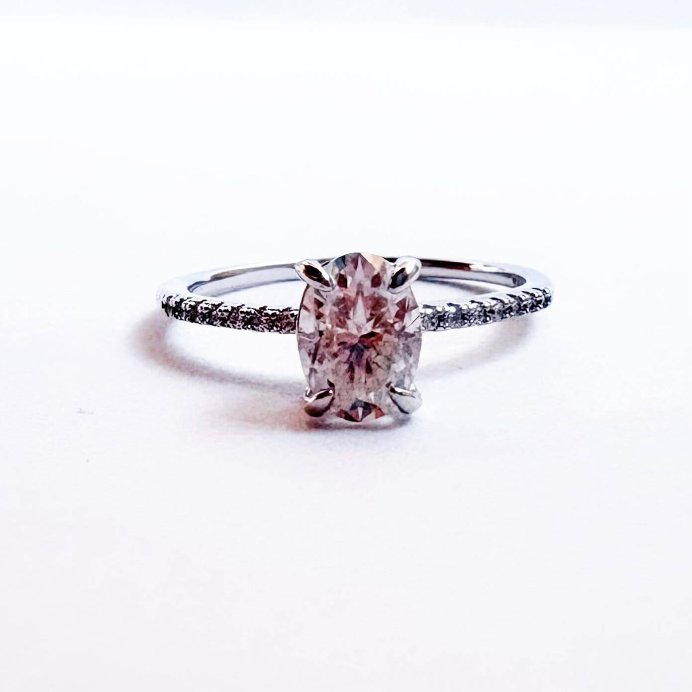 La banda, delicadamente adornada con un pavé, acompaña y realza la piedra central sin robarle protagonismo. Este diseño crea un equilibrio perfecto entre sutileza y presencia, aportando luminosidad desde cualquier ángulo y una sensación de elegancia continua en la mano. Los anillos con corte oval y pavé han sido favoritos de innumerables parejas a lo largo de los años, no solo por su estética refinada, sino porque estilizan el dedo y transmiten una sofisticación natural que no depende de tendencias pasajeras. ♡