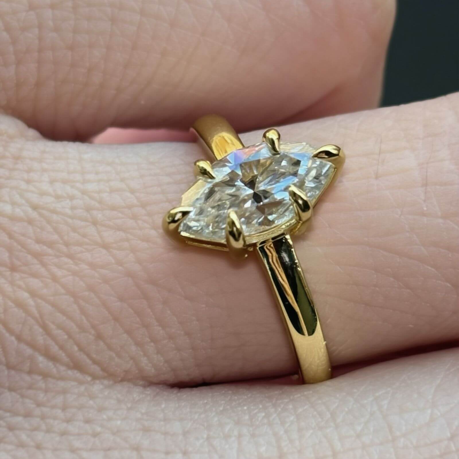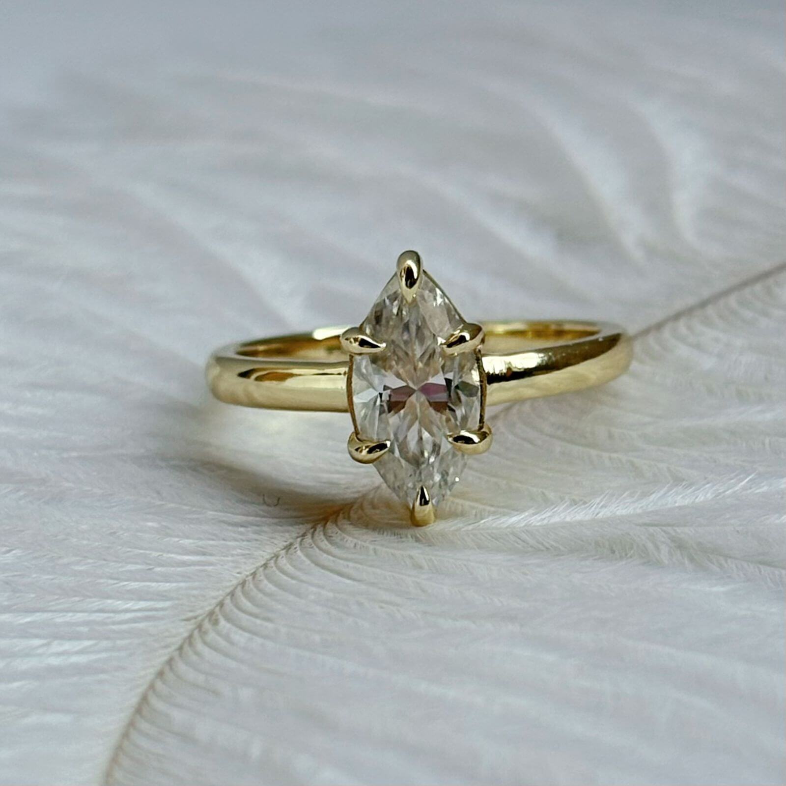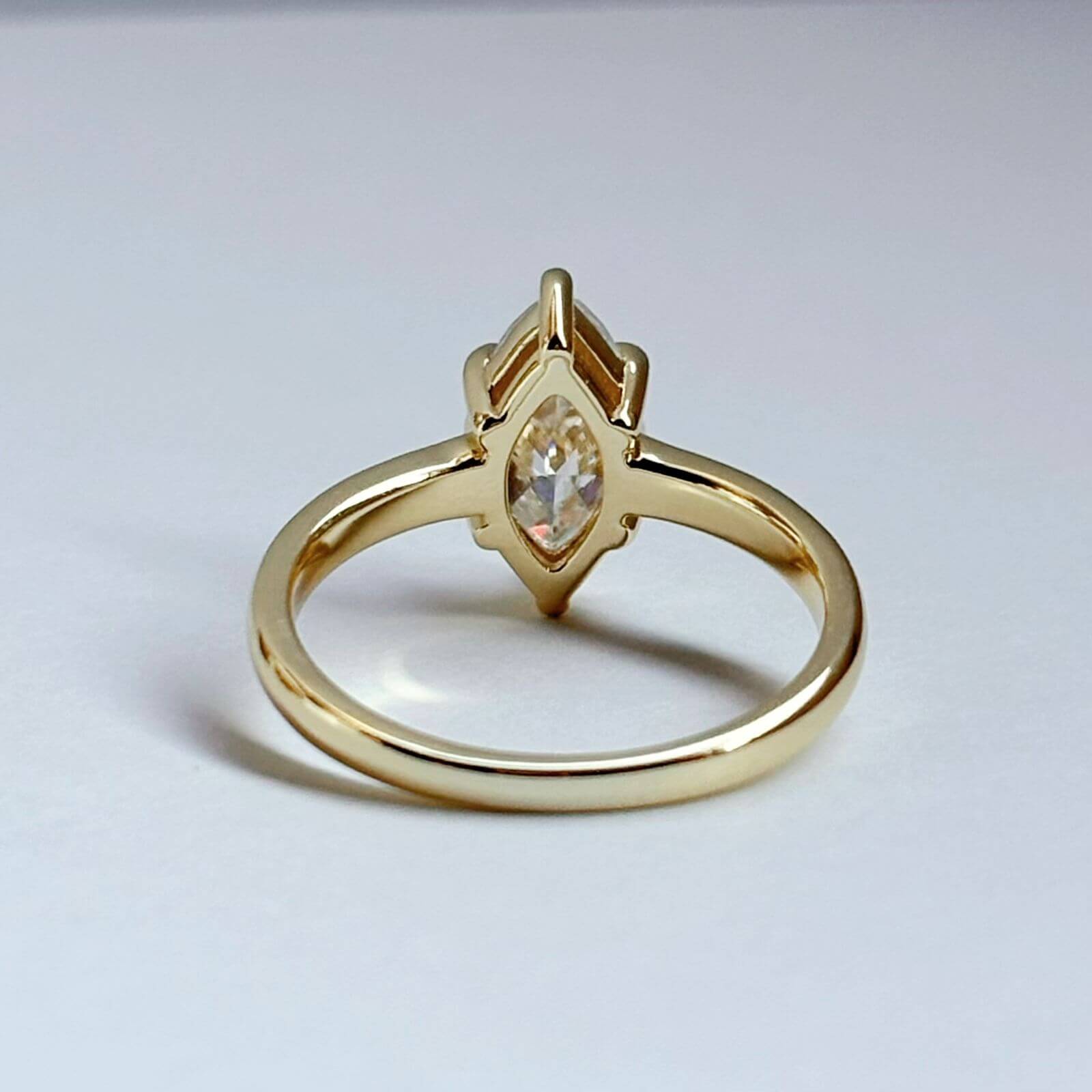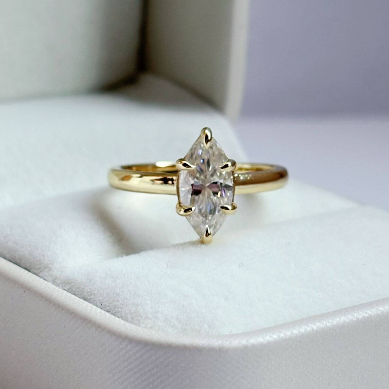 Este anillo de compromiso presenta una moissanita de 2 quilates en corte marquesa, una piedra que destaca por su brillo excepcional y una silueta alargada que estiliza la mano de forma natural, aportando elegancia y presencia.