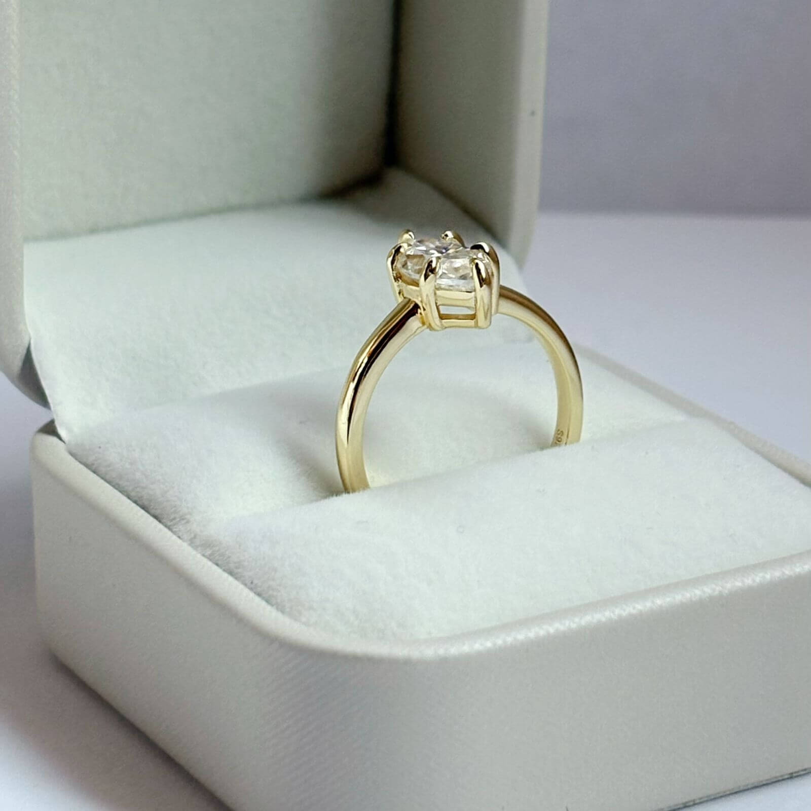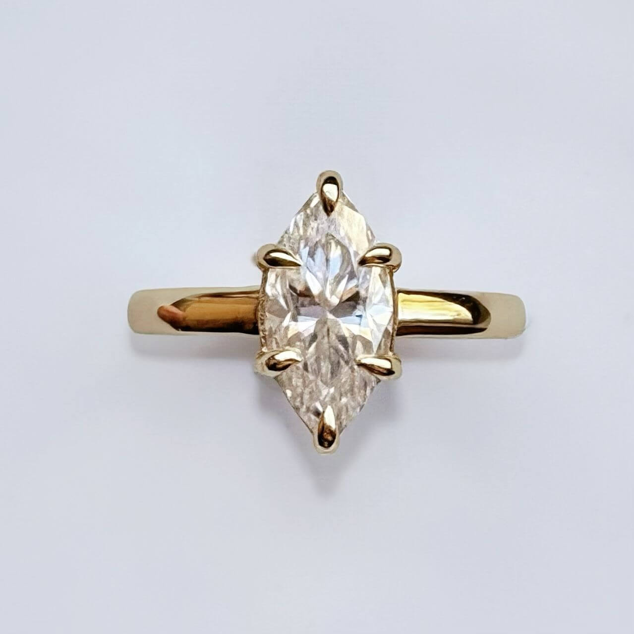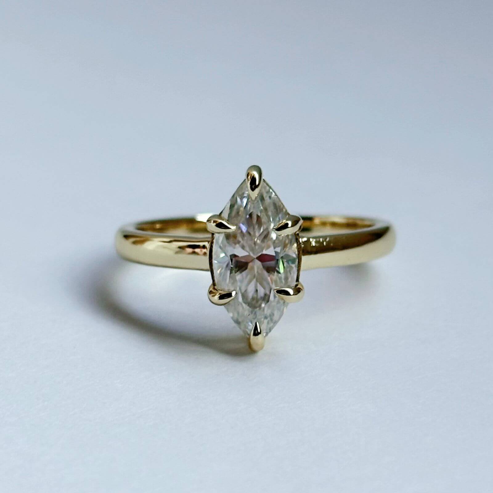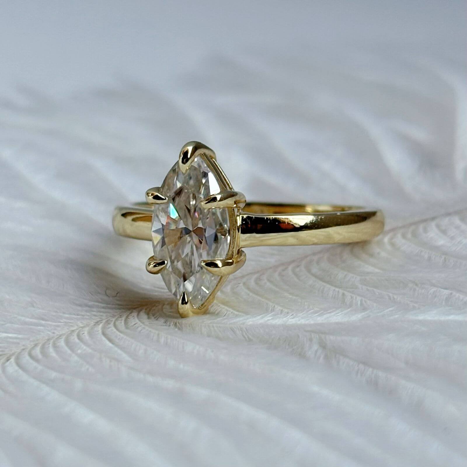 Este anillo de compromiso presenta una moissanita de 2 quilates en corte marquesa, una piedra que destaca por su brillo excepcional y una silueta alargada que estiliza la mano de forma natural, aportando elegancia y presencia.